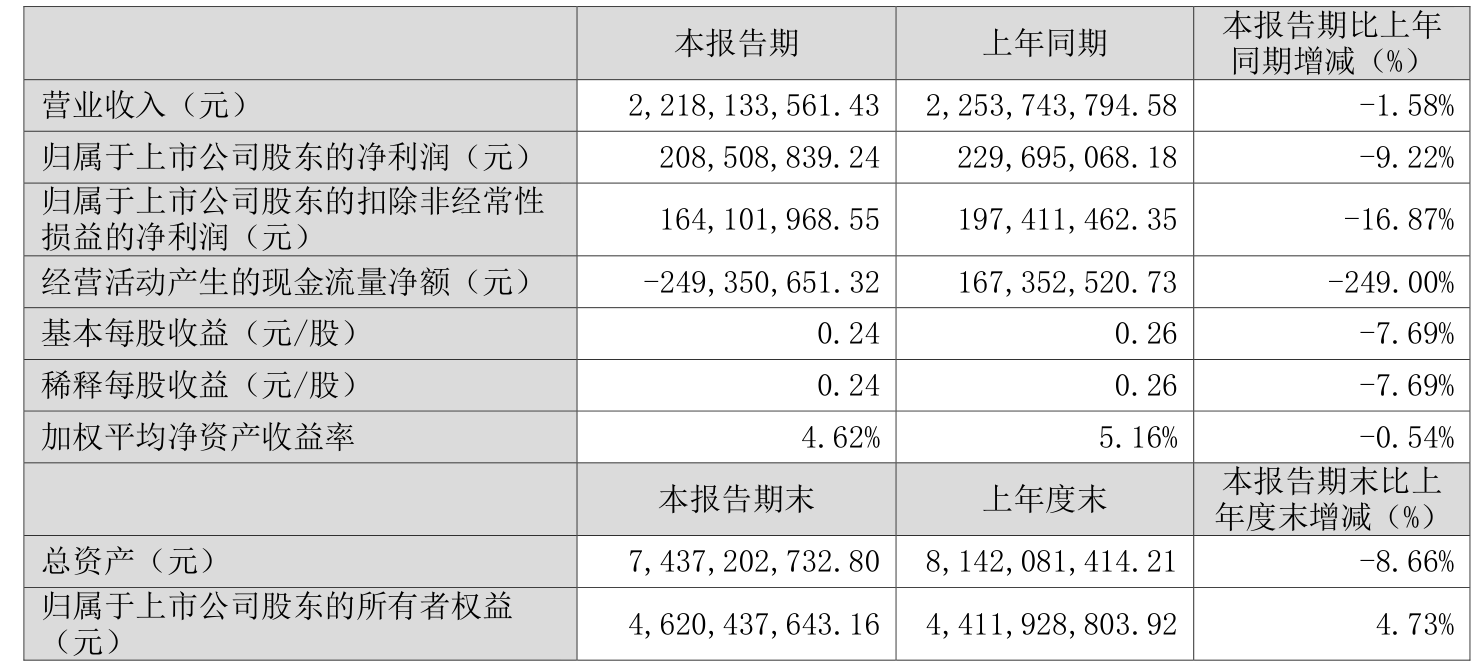 中证智能财讯三全食品(002216)4月22日披露2025年第一季度报告。公司实现营业总收入22.18亿元,同比下降1.58%;归母净利润2.09亿元,同比下降9.22%;扣非净利润1.64亿元,同比下降16.87%;经营活动产生的现金流量净额为-2.49亿元,上年同期为1.67亿元;报告期内,三全食品基本每股收益为0.24元,加权平均净资产收益率为4.62%。